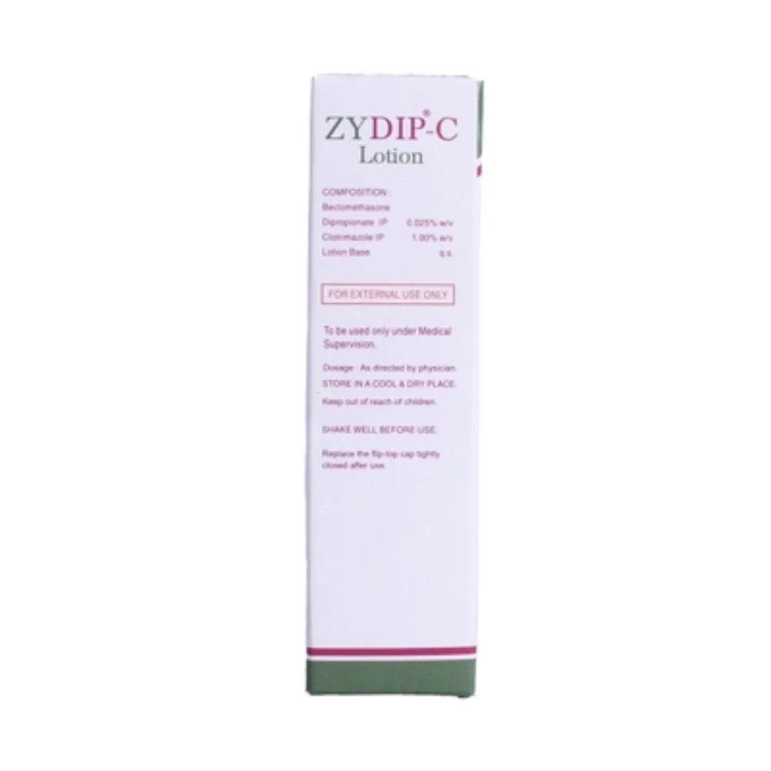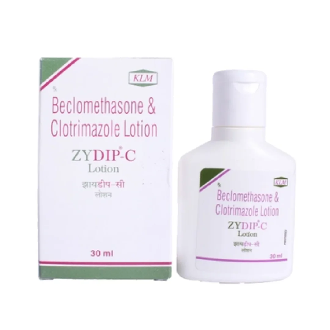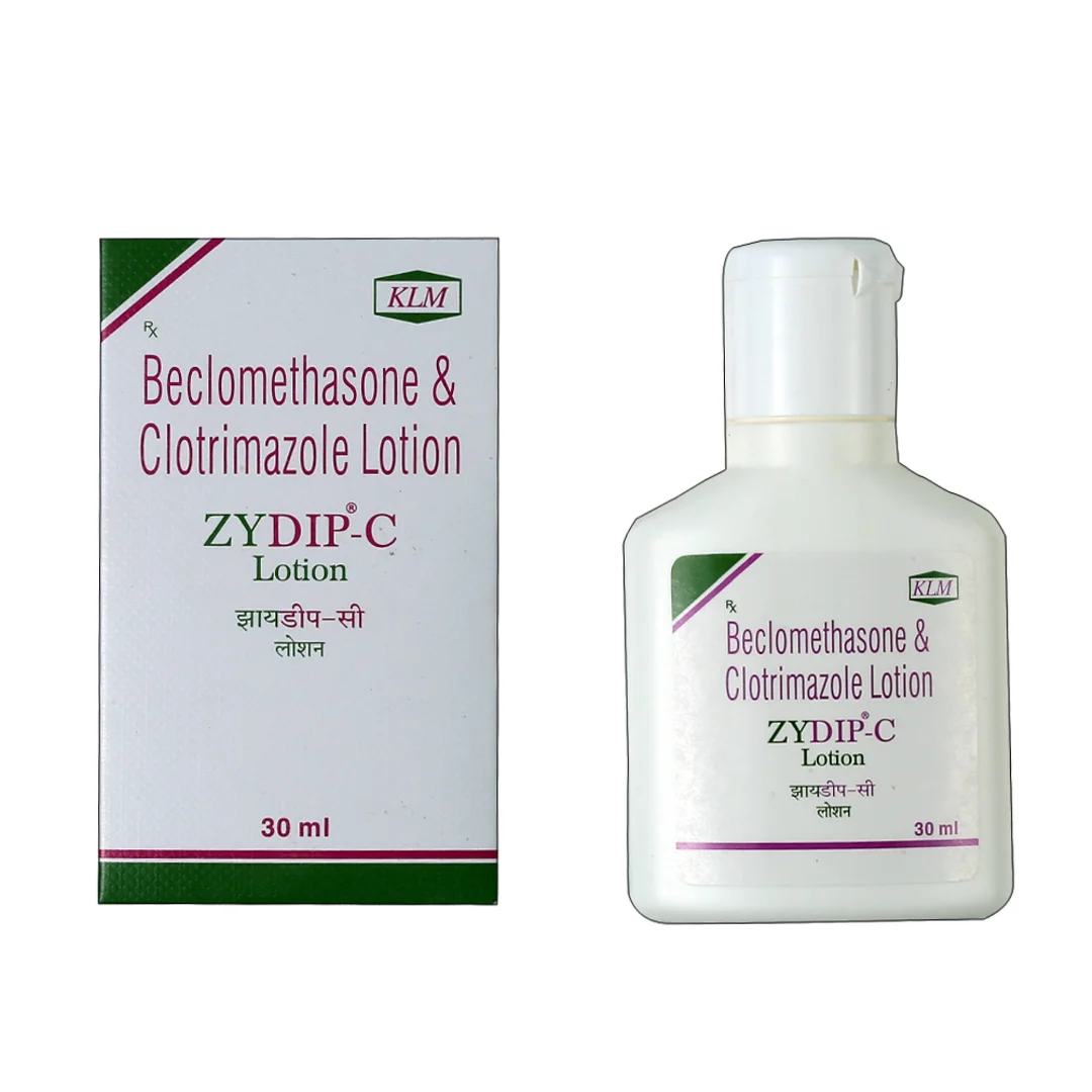 Zydip-C Lotion is used to treat fungal infections, such as ringworm of the foot (tinea pedis or athlete's foot), ringworm of the groin (tinea cruris or jock itch), and ringworm of the body (tinea corporis). It consists of two medicines: Clotrimazole (antifungal) and Beclomethasone (steroid). Clotrimazole stops the growth of fungi by causing damage and leakage to the fungal cell membrane. Beclomethasone belongs to the class of corticosteroids. It blocks the production of prostaglandins (chemical messengers) that make the affected area red, swollen and itchy.
